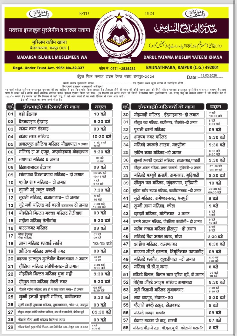 मदरसा प्रबंधन ने बताया कि चांद की तस्दीक होने के बाद रायपुर शहर की विभिन्न ईदगाहों और मस्जिदों में ईदुल फित्र की नमाज़ अदा की जाएगी, जिसके लिए नमाज़ का समय निर्धारित किया गया है। इस संबंध में तैयार की गई सूची में शहर की प्रमुख मस्जिदों और ईदगाहों में होने वाली नमाज़ का वक्त दिया गया है, जिससे नमाजियों को सहूलियत मिल सके ।