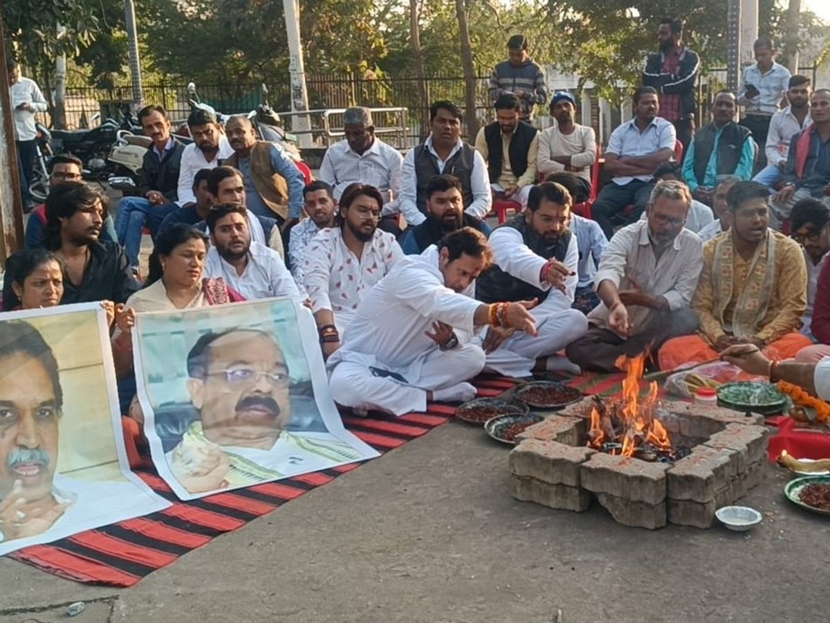 कांग्रेस ने किया ‘सद्बुद्धि यज्ञ’: मंत्री और विधायक का पोस्टर हाथ में लेकर कांग्रेसियों ने किया हवन