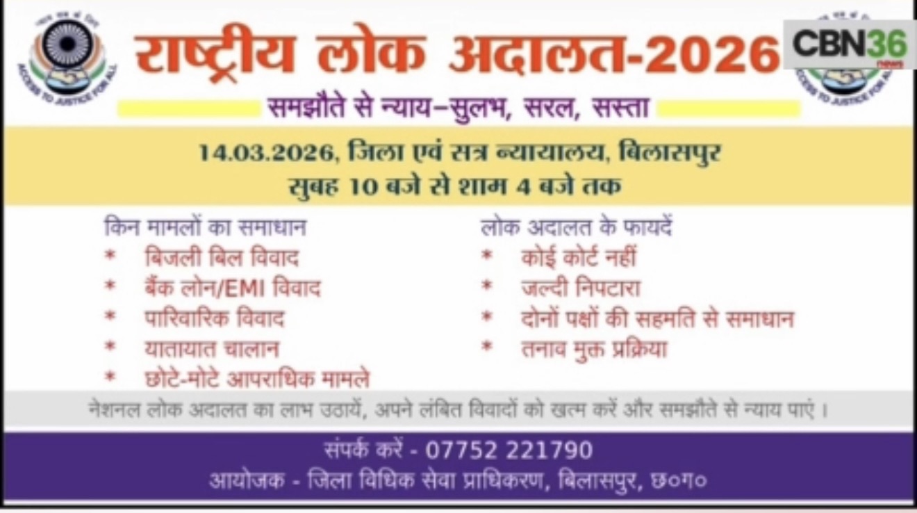 बिलासपुर। सभी के लिए न्याय तक पहुंच सुनिश्चित करने के उद्देश्य से राष्ट्रीय लोक अदालत 2026 का आयोजन 14 मार्च 2026 को जिला एवं सत्र न्यायालय, बिलासपुर परिसर में किया जाएगा। लोक अदालत का आयोजन सुबह 10 बजे से शाम 4 बजे तक होगा।